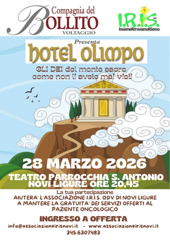 Assistendo ad un gradevole e divertente spettacolo che ci riporterà nell’antica Grecia tra gli dei dell’Olimpo, potrete contribuire ad aiutare l’Associazione I.R.I.S. ODV a mantenere la gratuità dei servizi offerti al malato oncologico e ai suoi familiari.