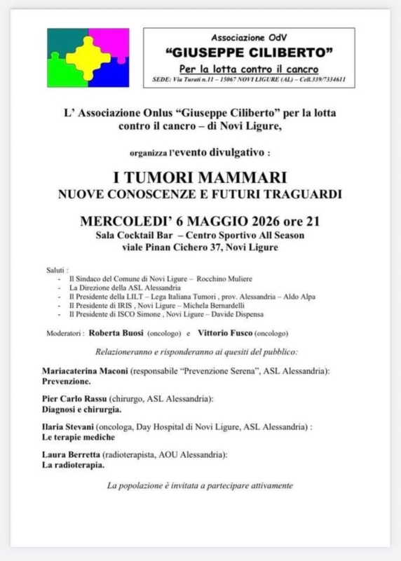 Nuovo incontro informativo organizzato dall’Associazione Ciliberto ODV: i tumori mammari nuove conoscenze e futuri traguardi, con la partecipazione degli esperti del settore del territorio novese.