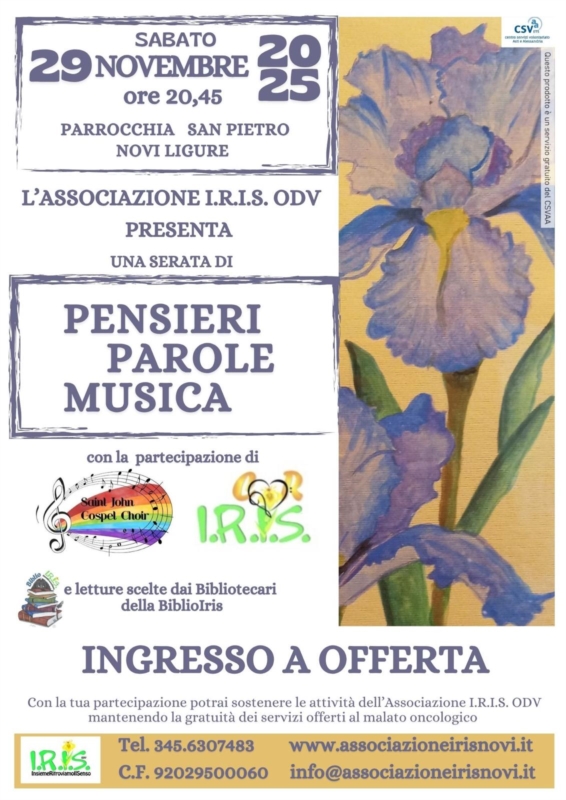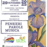 Sabato 29 novembre alle ore 20.45, la Parrocchia di San Pietro ospiterà il concerto annuale organizzato dall'Associazione I.R.I.S ODV dal titolo "Pensieri Parole Musica".